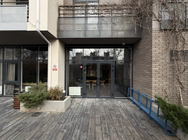 Фасад выходит во двор в зону отдыха, рядом кабинет психолога, дизайн-студия.